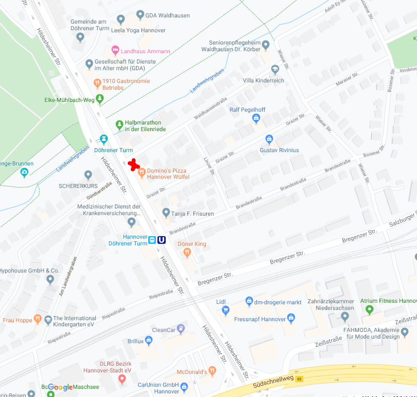 Waldhausenstr. 2a 30519 Hannover PKW: Stadtauswärts über Hildesheimerstr. Döhrener Turm; Ecke Waldhausenstraße, das Erste Haus,Waldhausenstr. 2a Eingang über Hildesheimerstraße! Öffentliche Verkehrmittel: Stadtauswärts: Mit den U-Bahnlinien: Linie 1 Richtung Laatzen Linie 2 Richtung Rethen Linie 8 Richting Meesegelände Haltestelle: Döhrener Turm |